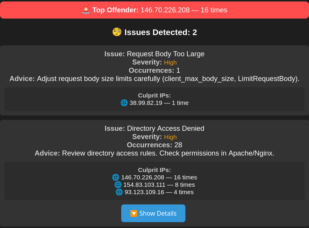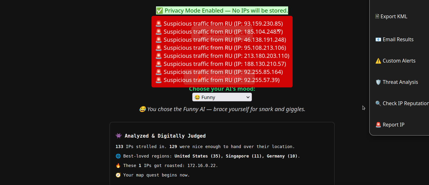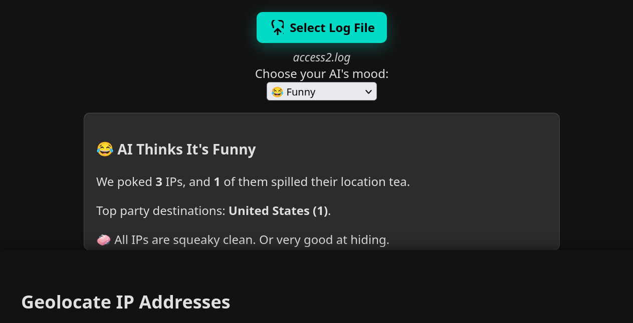 geolocates them on an interactive map πΊοΈ, and analyzes traffic by country π β all right in your browser, no data leaves your device π.